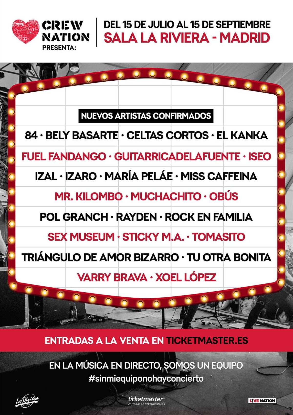 Crew Nation Presenta, el ciclo de conciertos en colaboración con La Riviera madrileña para recaudar fondos y dar visibilidad a los técnicos de artistas, músicos y personal de gira, anuncia diez nuevos artistas que se suman a esta iniciativa y que actuarán entre el 15 de julio y el 15 de septiembre en la capital.
