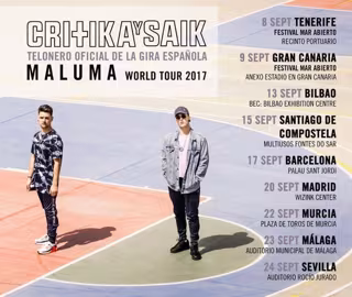 Critika y Saik serán los invitados especiales en España del Maluma World Tour 2017, la gira con la que la estrella de la música latina está dando la vuelta al mundo y que llegará a nuestro país en septiembre.