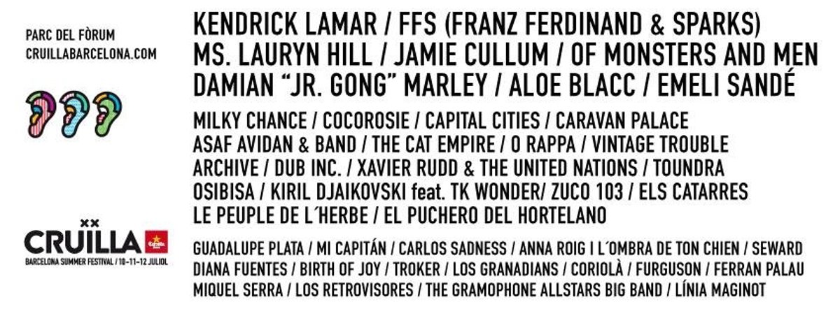 El Festival Cruïlla de Barcelona, que se celebrará del 10 al 12 de julio en el Parc del Fòrum, ha sumado a su programación los artistas Kendrick Lamar, M. Lauryn Hill, Aloe Blacc, Emeli Sande, Milky Chance y CocoRosie, según ha informado la organización en un comunicado.
