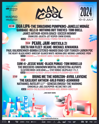 Por el momento, el 10 de julio se subirán a los escenarios del festival en el recinto Iberdrola Music en el distrito de Villaverde (Madrid), Dua Lipa, The Smashing Pumpkins y Janelle Monáe como cabezas de la jornada. Ese mismo día, el resto de conciertos estarán protagonizados por Garbage, Rels B, Nothing But Thieves y Tom Odell, así como James Arthur, Kenya Grace, Soccer Mommy, Crawlers, Julieta, Jet Vesper y Swim School.