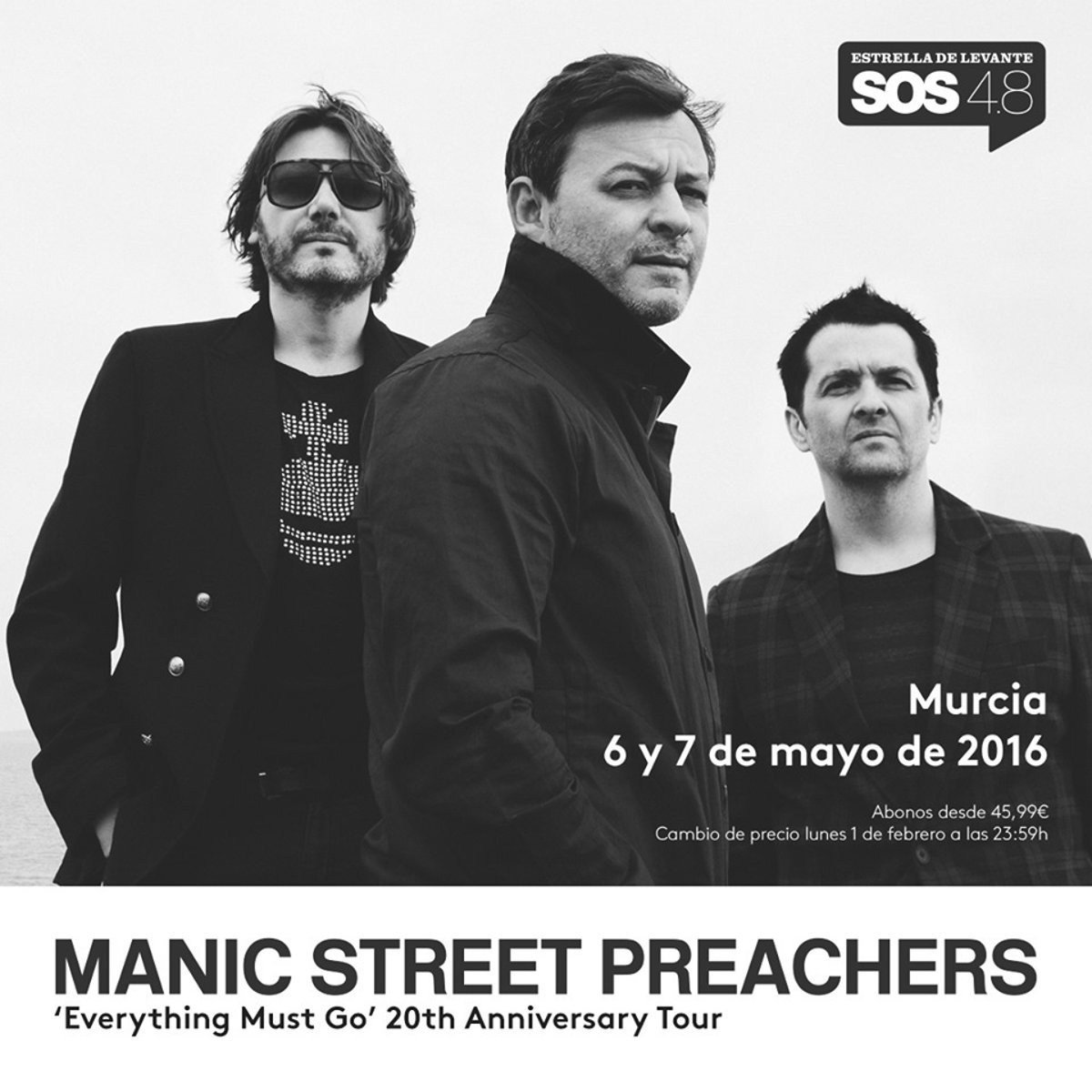 El SOS 4.8 Festival de este año, que se celebrará en Murcia los días 6 y 7 de mayo, ha confirmado la presencia de los galeses Manic Street Preachers, que están celebrando el 20 aniversario de su disco Everything must go.