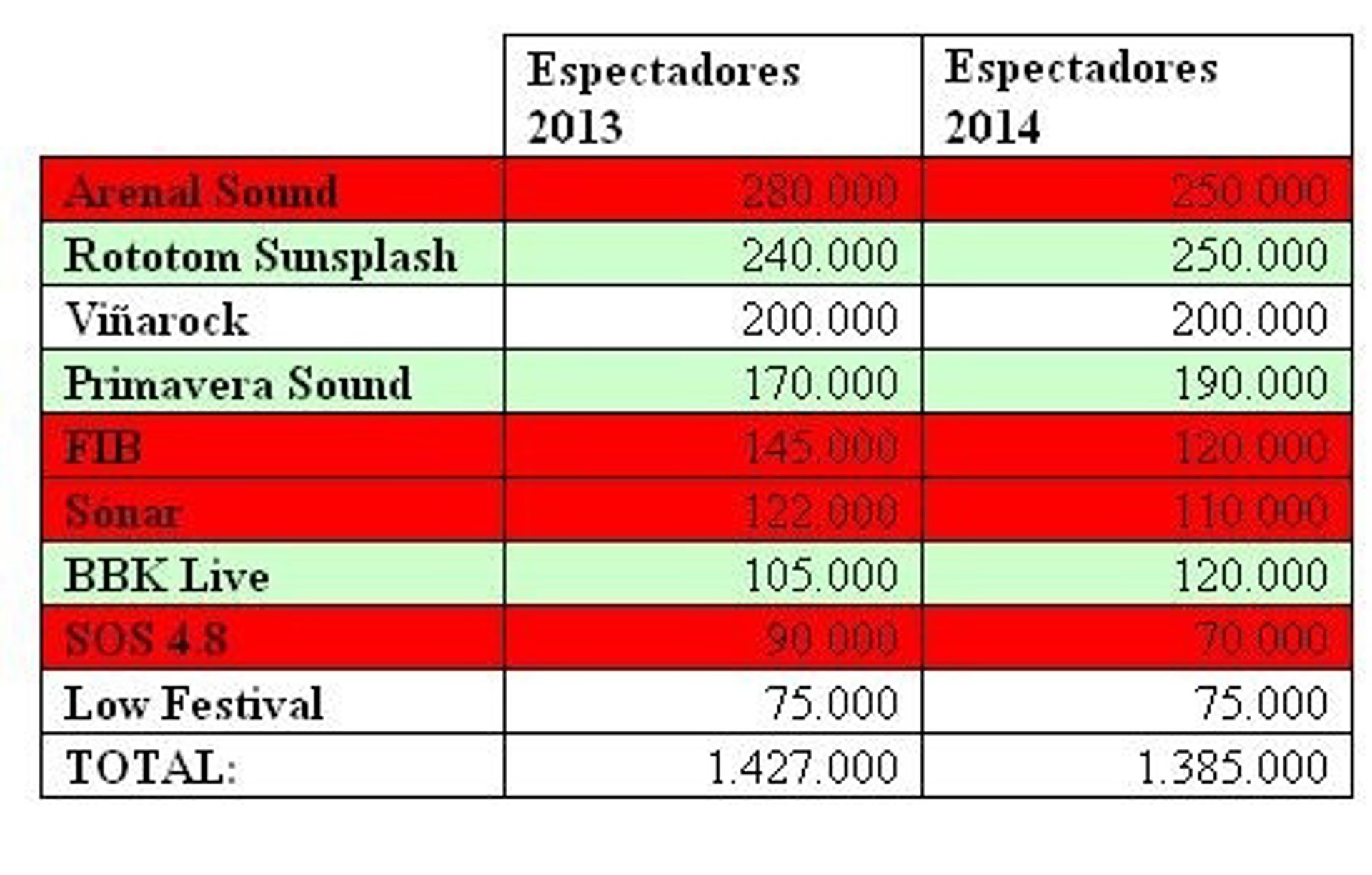 El festival que experimentó un mayor descenso en número de asistentes es el Arenal Sound, celebrado en agosto en la localidad valenciana de Burriana, que perdió 30.000 personas, tras caer de 280.000 de 2013 a los 250.000 de 2014. A su vez, el FIB, que se celebró en julio en la ciudad de Benicasim (Castellón), sumó en la pasada edición un total de 120.000 personas, a diferencia de las 145.000 que reunió el año anterior.