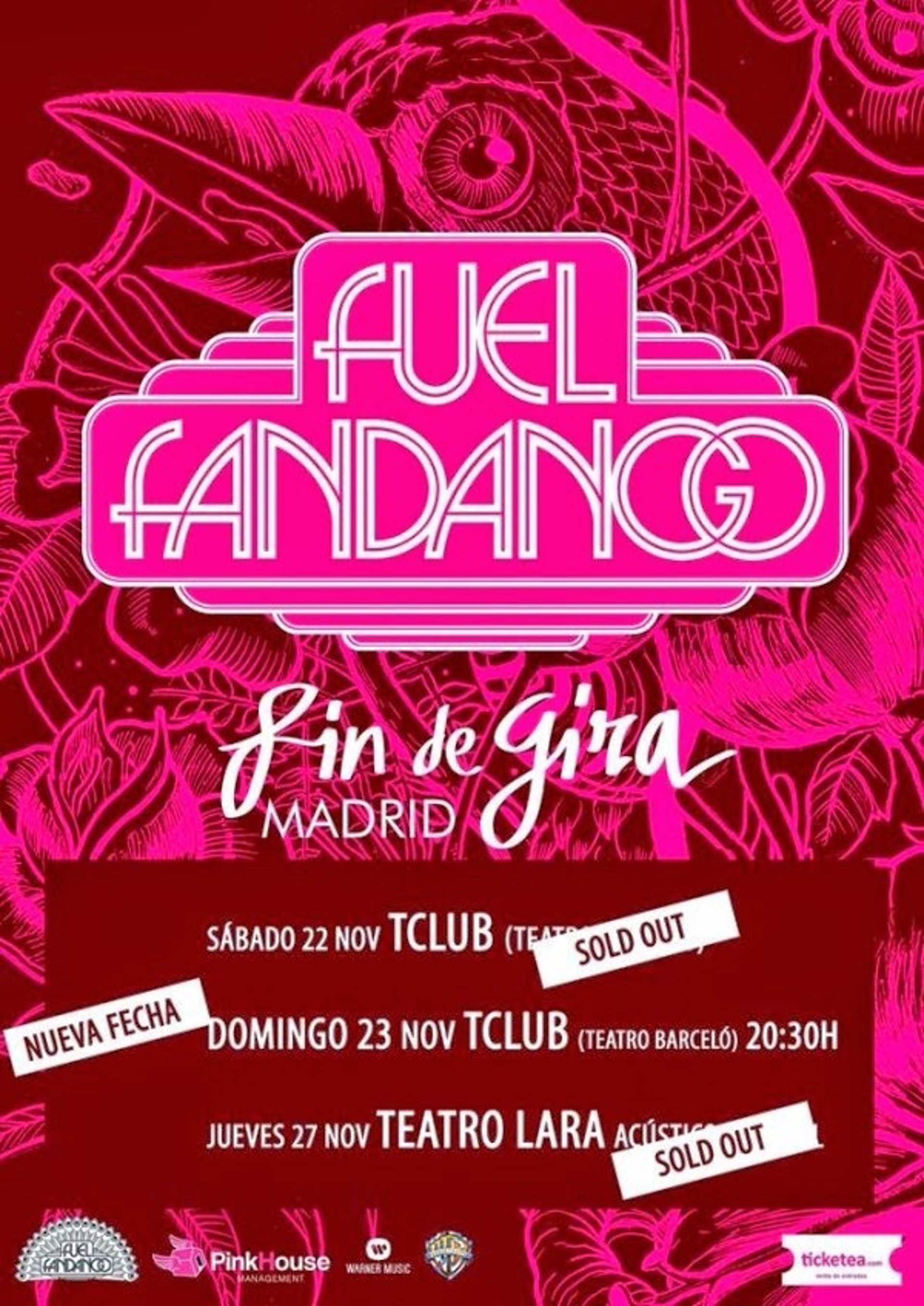 El tercero de los conciertos será el jueves 27 de noviembre en el Teatro Lara. Este último concierto será en formato acústico con banda, algo que Fuel Fandango no ha hecho hasta el momento en ningún concierto. Las entradas también están agotadas.