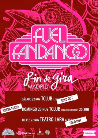 Fuel Fandango despide sus 'Trece Lunas' en Madrid con tres conciertos. El primero será en el Teatro Barceló (T Club) el sábado 22 de noviembre con entradas ya agotadas; y el segundo será el 23 de noviembre también en el Teatro Barceló (en ambos conciertos estarán acompañados de la banda y en eléctrico).
