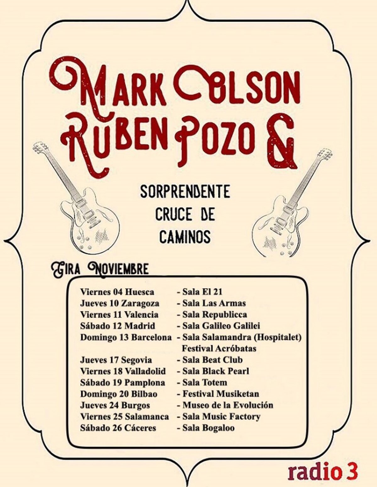 Esta gira comenzará en Huesca (4 de noviembre en la Sala El 21) y visitará después Zaragoza (10 de noviembre en Las Armas), Valencia (11 de noviembre en Republicca), Madrid (12 de noviembre en Galileo Galilei), Hospitalet (13 de noviembre en Salamandra) y Segovia (17 de noviembre en el Festival Acróbatas del Beat Club).