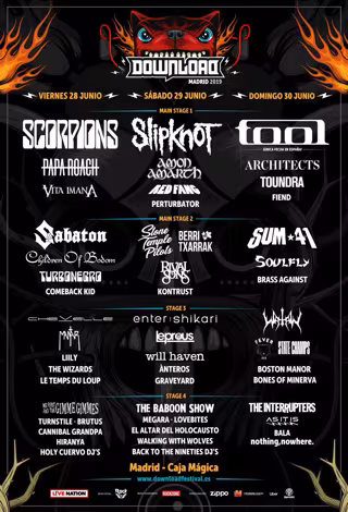 Un total de 53 bandas sonarán este año en Download Festival Madrid, que se celebrará del 28 al 30 de junio en La Caja Mágica, destacando Scorpions, Slipknot, Tool, Papa Roach, Amon Amarth, Sum 41 o Sabaton.