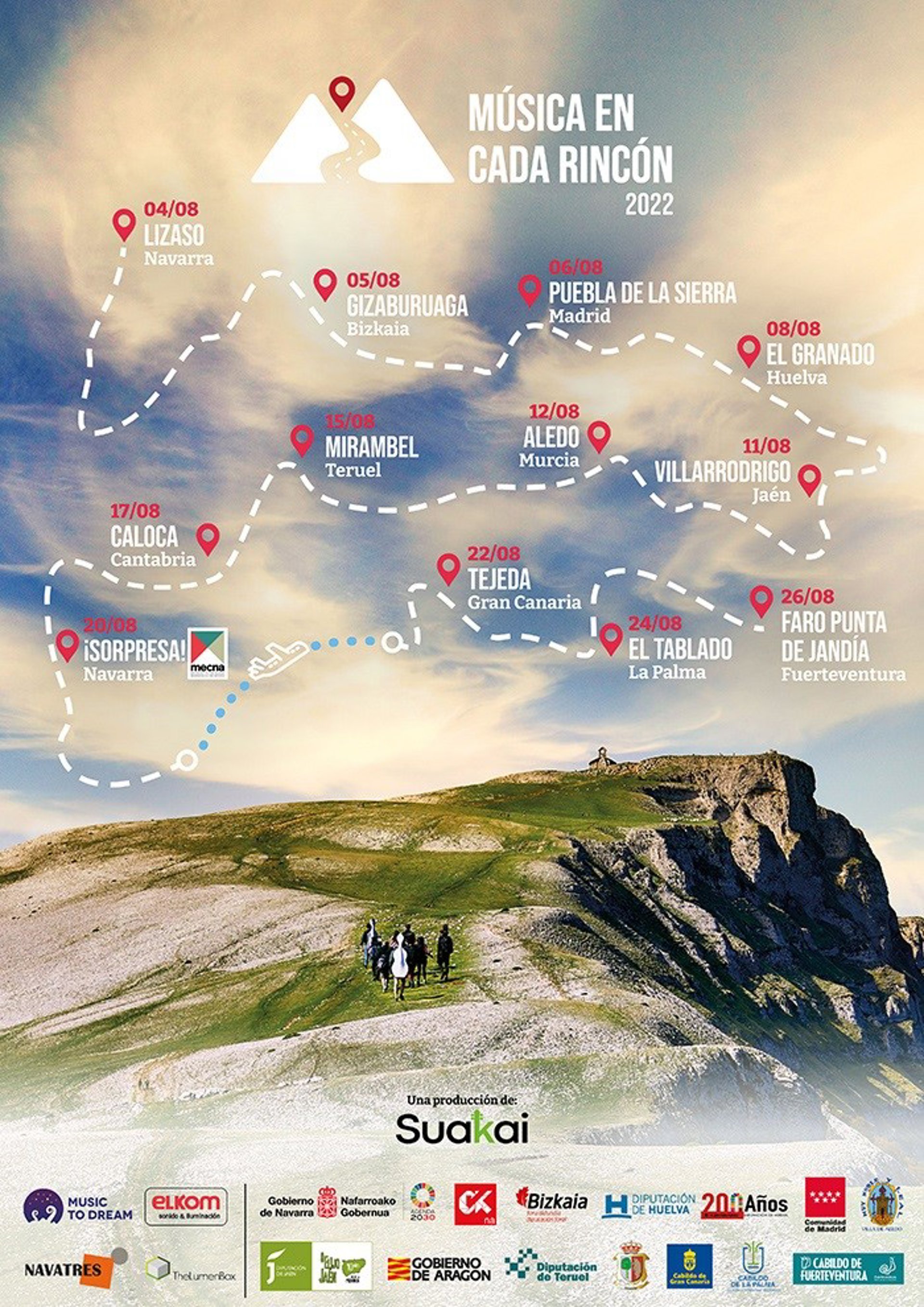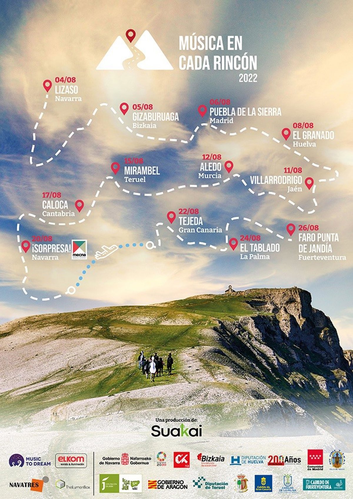 La III edición de 'Música en cada rincón' realizará este mes de agosto una gira de 12 conciertos por los municipios más pequeños de cada comunidad autónoma, una iniciativa puesta en marcha por la empresa musical navarra Suakai, cuyo objetivo es "trasladar el arte y la cultura a poblaciones tradicionalmente excluidas de las grandes producciones artísticas".