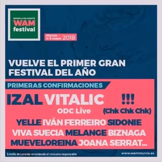 Izal, Vitalic ODC Live, !!! (Chk Chk Chk), Yelle, Iván Ferreiro, Sidonie, Viva Suecia, Melange, Biznaga, Mueveloreina y Joana Serrat son los primeros 11 nombres que pasarán por Murcia el primer fin de semana de mayo para actuar en el WAM Estrella de Levante, en una nueva demostración de la apuesta que el festival hace por la "diversidad de propuestas artísticas en el marco del festival", según informa la organización en un comunicado remitido a Europa Press.