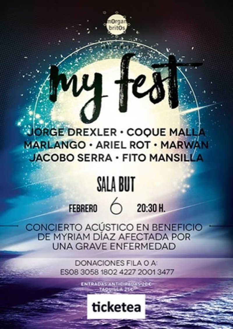 La Sala But de Madrid acogerá este sábado, 6 de febrero, un concierto benéfico con las actuaciones de Jorge Drexler, Coque Malla, Marlango, Ariel Rot, Marwan, Jacobo Serra y Fito Mansilla.