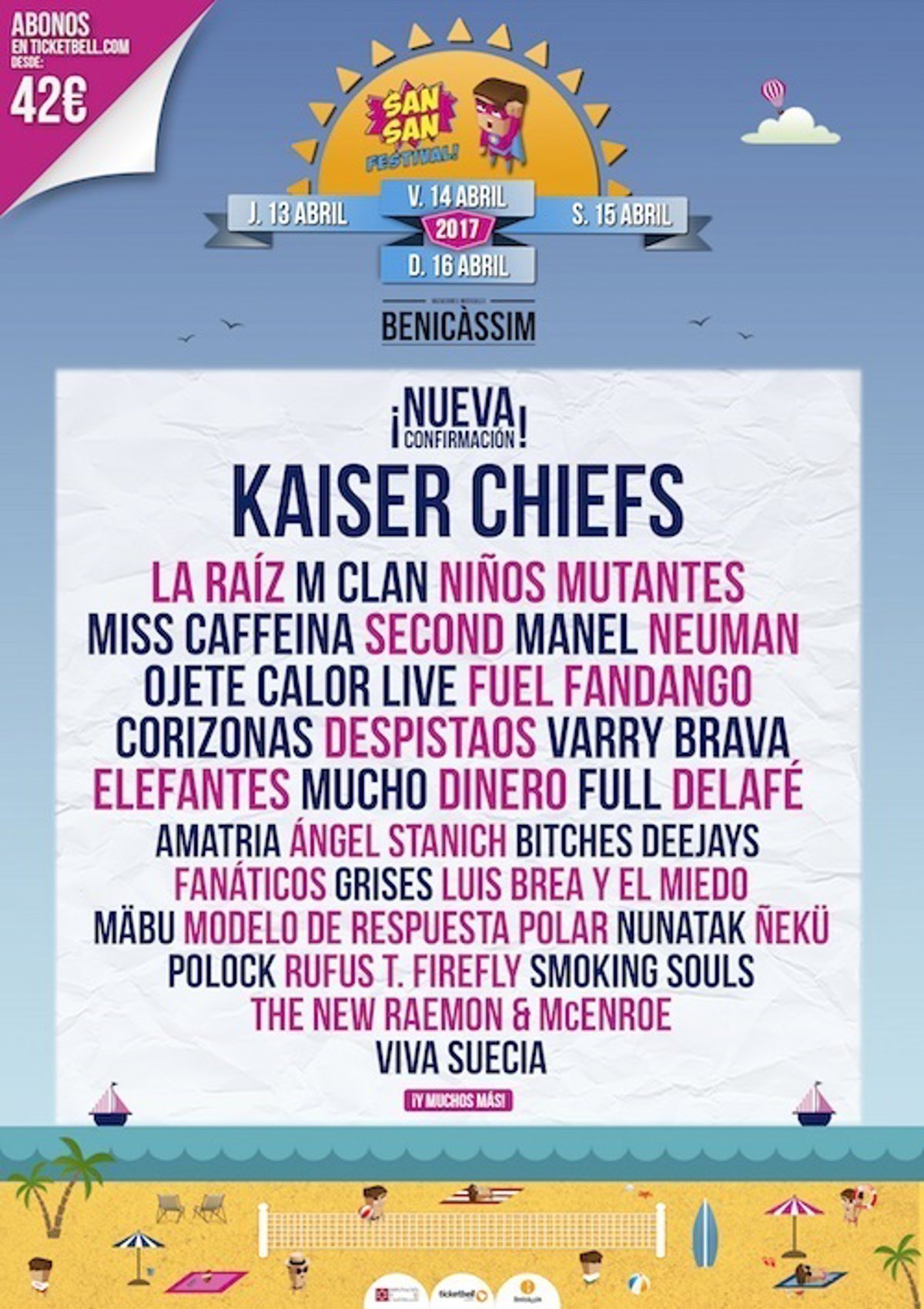 Kaiser Chiefs se suman a un cartel que ya contaba con M Clan, Second, La Raíz, Elefantes, Miss Caffeina, Neuman, Manel, Niños Mutantes, Fuel Fandango, Varry Brava, Dinero, Full, Grises, Polock, Modelo de Respuesta Polar y Luis Brea y El Miedo, Rufus T. Firefly, Mucho, Ojete Calor, Corizonas, Despistaos, The New Raemon & McEnroe, Amatria, Ángel Stanich, Viva Suecia, Smoking Souls, Delafé, Nunatak, Mäbu, Fanáticos, Ñekü y Bitches Deejays.