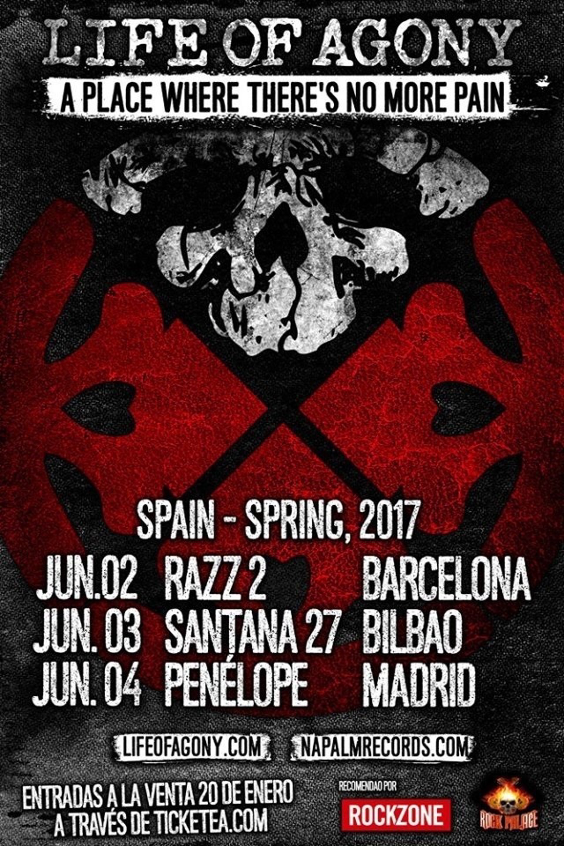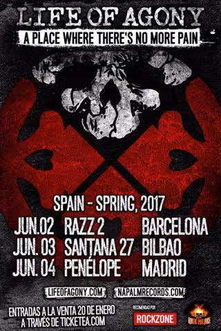 Life of Agony visitarán España la próxima primavera para ofrecer un total de tres conciertos en otras tantas ciudades con la gira de presentación de su próximo disco, A place where there's no more pain, a la venta el 28 de abril.