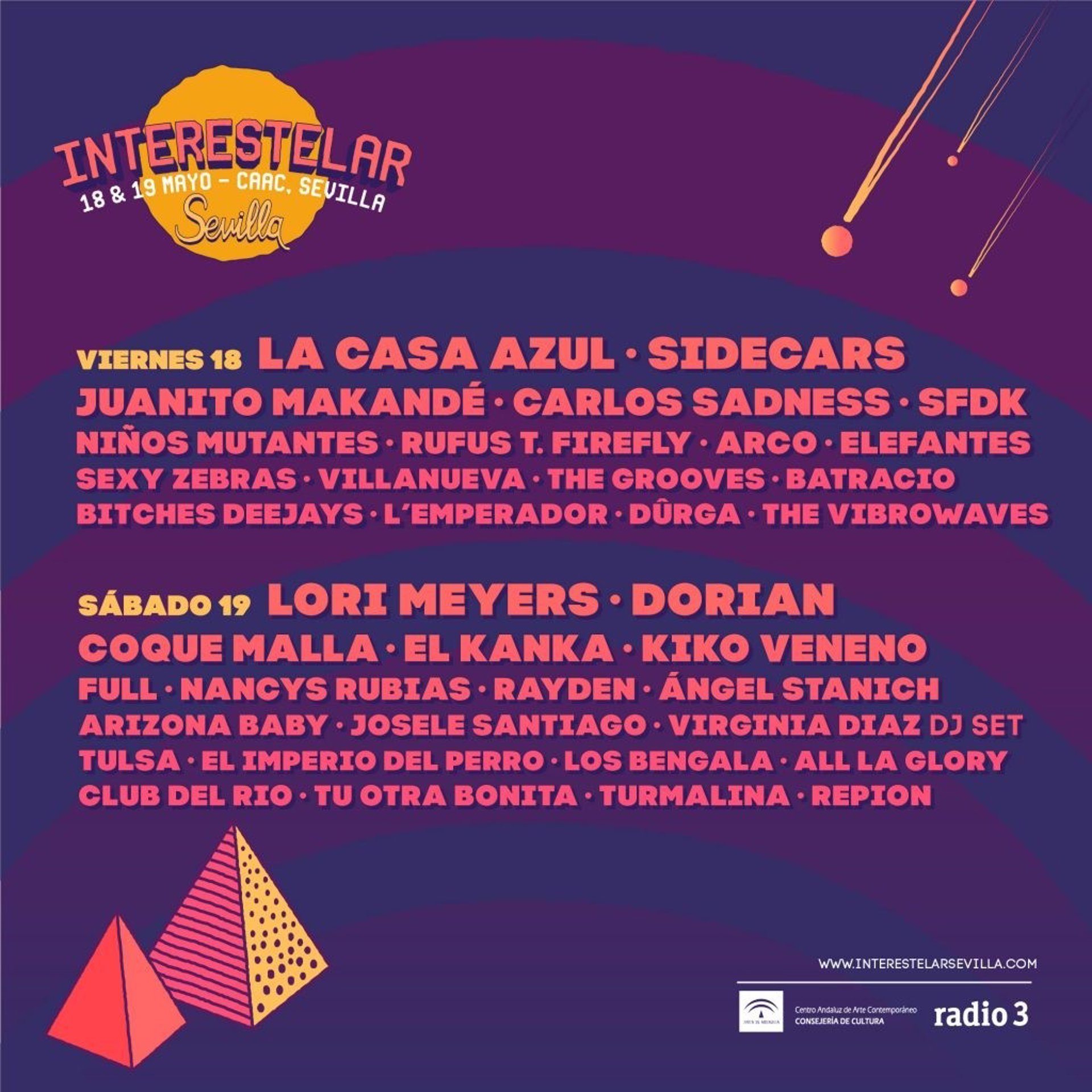 Lori Meyers, Dorian, La Casa Azul, Sidecars, Juanito Makandé, Carlos Sadness, Coque Malla, Niños Mutantes, SFDK, El Kanka, Kiko Veneno o Nancys Rubias son algunos de los artistas que participarán en la tercera edición de Interestelar, que se celebra este viernes 18 de mayo y sábado 19 en el Centro Andaluz de Arte Contemporáneo (CAAC).