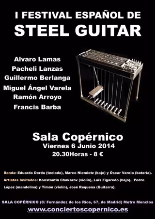 El próximo viernes 6 de junio tendrá lugar en la Sala Copérnico de Madrid el primer Festival Español de Steel Guitar, con la participación de los intérpretes Álvaro Lamas, Francis Barba, Guillermo Berlanga, Miguel Ángel Varela, Pacheli Lanzas y Ramón Arroyo.