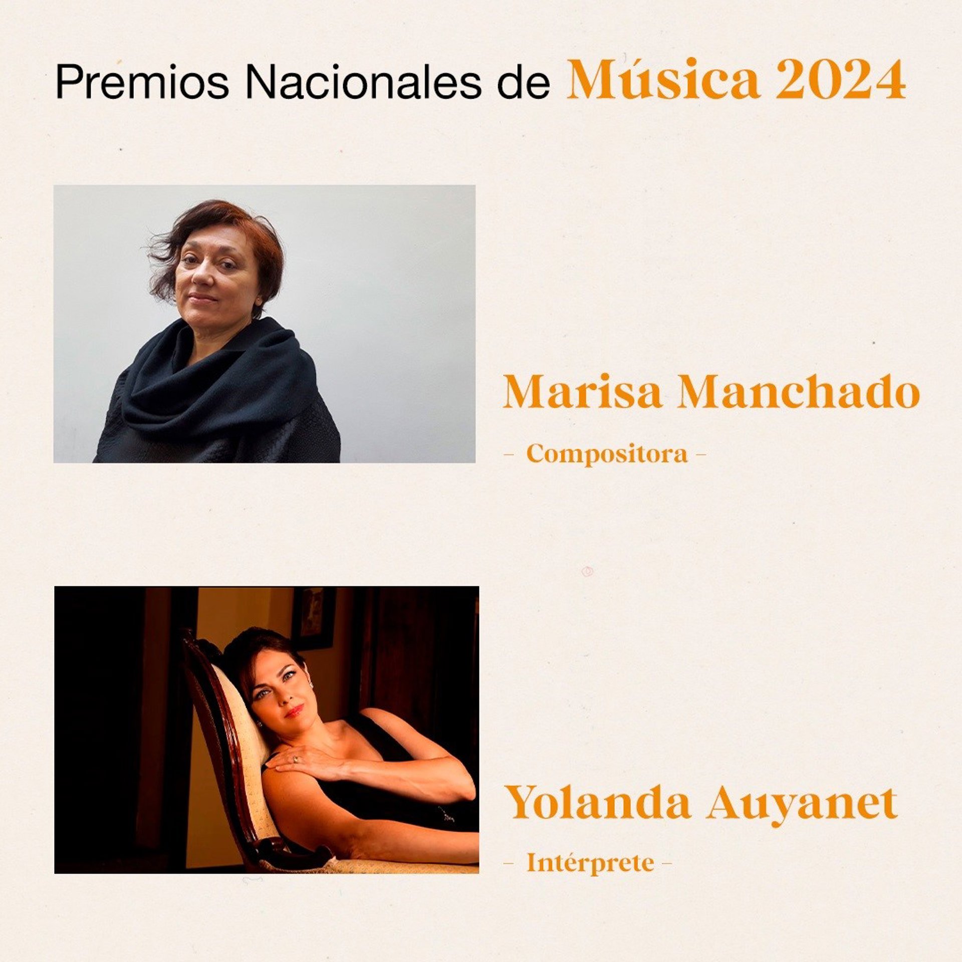 El jurado de los Premios Nacionales de Música 2024 ha propuesto la concesión de estos galardones a la compositora Marisa Manchado, en la modalidad de Composición, y a la soprano Yolanda Auyanet, en la modalidad de Interpretación.