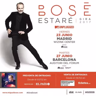 Las entradas se podrán adquirir en Ticketmaster, Ticketea, www.miguelbose.com y www.planetevents.es para ambas ciudades a partir del próximo lunes 6 de febrero, además de en www.theproject.es para Barcelona.