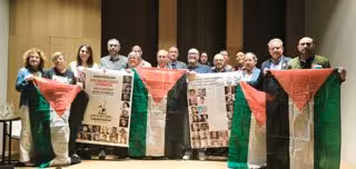 Miembros de la plataforma PararLaGuerra posan con banderas de Palestina en el Ateneo de Madrid. - PARARLAGUERRA