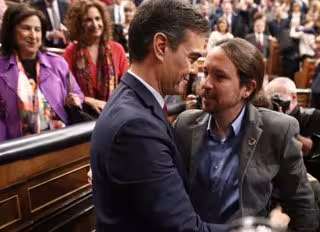 El secrretario general de Podemos, Pablo Iglesias, felicita al al presidente del Gobierno, Pedro Sánchez, tras ser elegido al finalizar la segunda sesión de votación para la investidura del candidato socialista a la Presidencia del Gobierno - Eduardo Parra - Europa Press