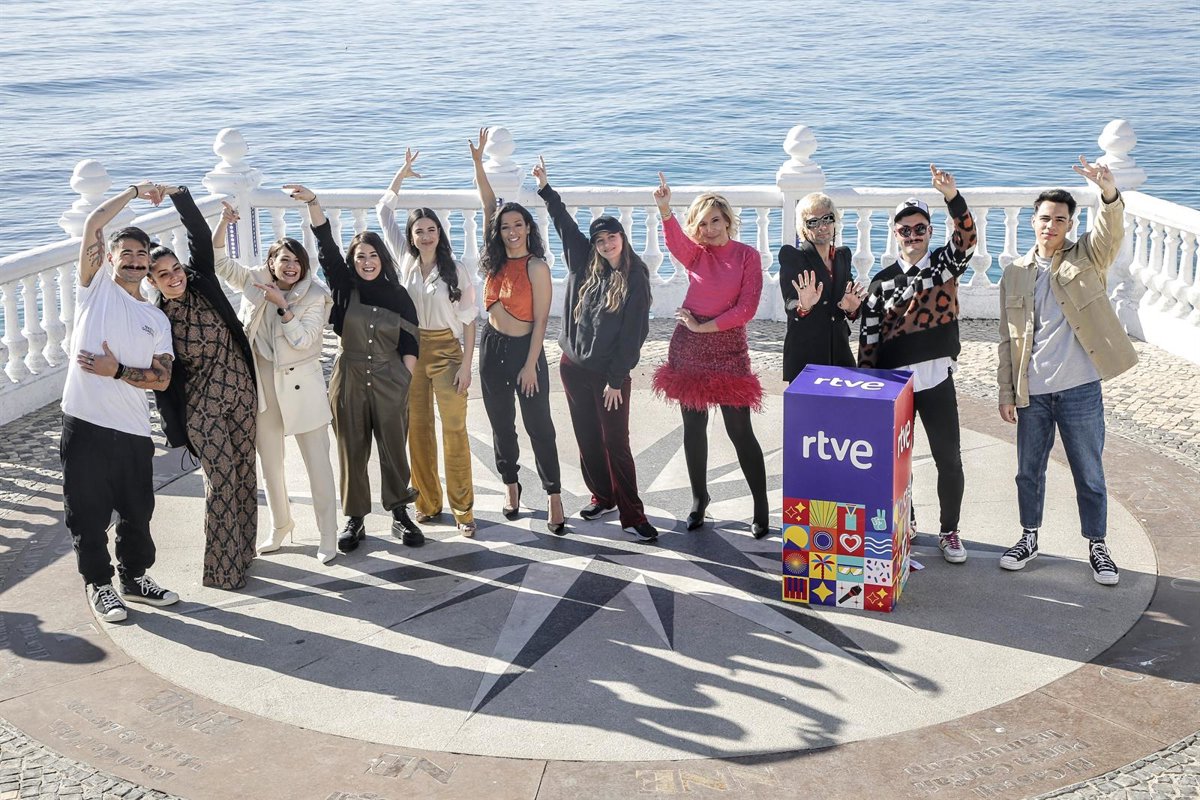 (I-D) Rayden, Tanxugueiras, Blanca Paloma, Chanel, Rigoberta Bandini, la directora de Comunicación y Participación de RTVE, María Eizaguirre, Varry Brava y Xeinn, posan con una bandera de España, a 27 de enero de 2022, en Benidorm - Joaquín Reina - Europa Press