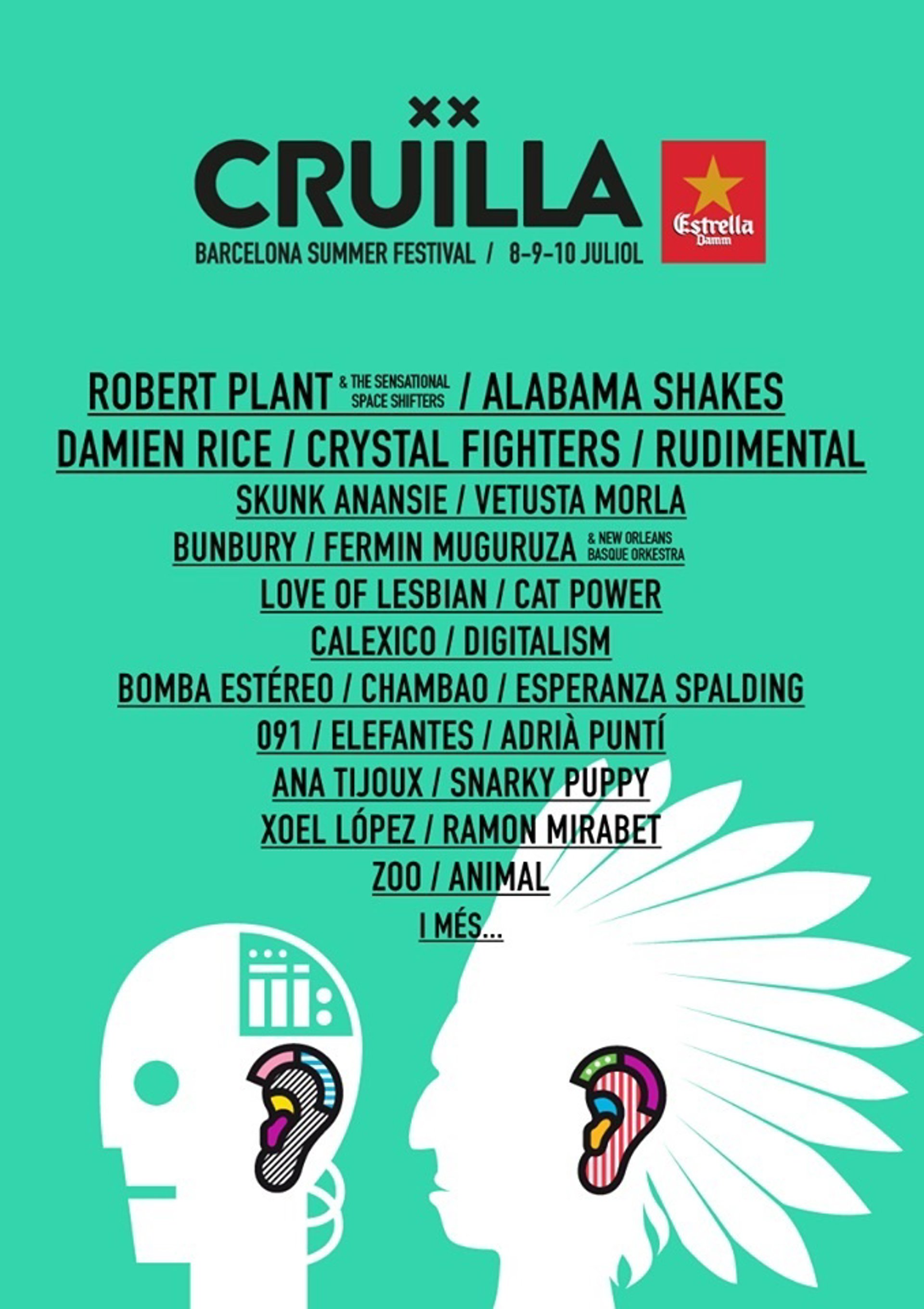 El Festival Cruïlla Barcelona, que celebrará su séptima edición los días 8, 9 y 10 de julio en el recinto del Fórum de Barcelona, tendrá como cabezas de cartel a Alabama Shakes, Damien Rice y Crystal Fighters, además de Robert Plant & The Sensational Space Shifters y Rudimental, estos dos, últimas incorporaciones anunciadas este jueves, entre otras.