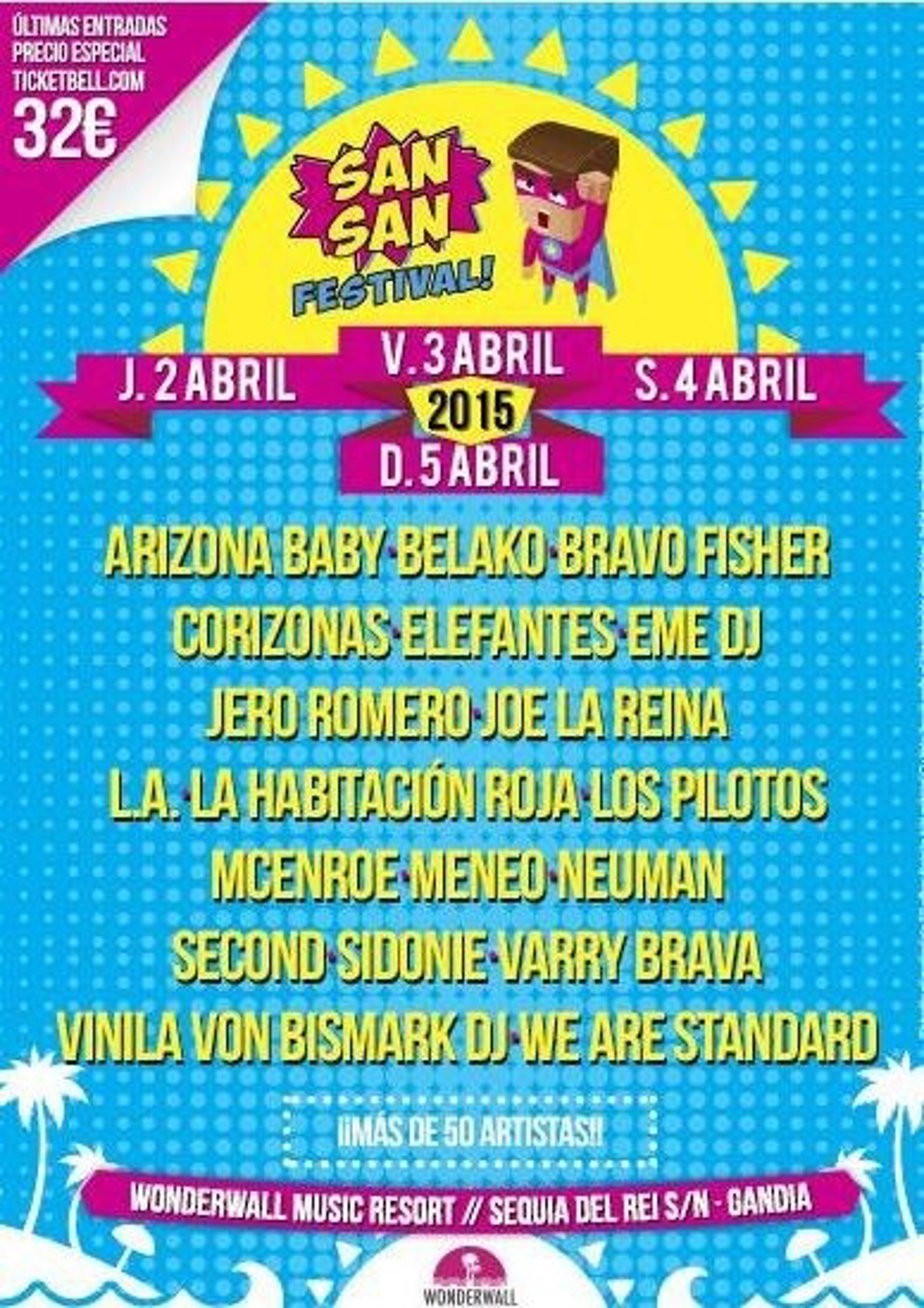 Después de su debut del pasado año, el SanSan Festival regresará en 2015 con una segunda edición que se celebrará otra vez en plena Semana Santa, en esta ocasión los días 2, 3, 4 y 5 de abril, de nuevo en el Wonderwall Music Resort de Gandía (Valencia).