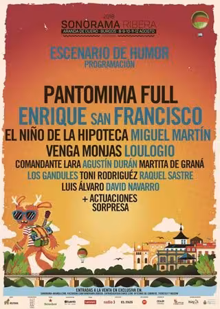 Sonorama Ribera se convierte este año en el primer festival español en incluir un espacio dedicado a la comedia, un Escenario de Humor por el que pasarán Pantomima Full, Enrique San Francisco, El Niño de la Hipoteca, Miguel Martín, Venga Monjas, Loulogio, Comandante Lara, Agustín Durán, Martita de Graná, Los Gandules, Toni Rodríguez, Raquel Sastre, Luis Álvaro y David Navarro, entre muchas otras sorpresas aún por anunciar.