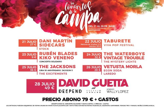 La apertura del 21 de julio corrió a cargo de Dani Martín, a quien siguió el domingo 22 la fiesta Viva Vop con Taburete o Carolina Durante, entre otros. Este lunes 23 toman el testigo Kiko Veneno y Rubén Blades en una noche solidaria que destina toda la recaudación al Proyecto de Amara Cantabria, la Asociación de Padres de Niños con Cáncer de Cantabria -el precio de la entrada es simbólico, dese 9 euros la entrada normal y 45 euros en la zona VIP-.