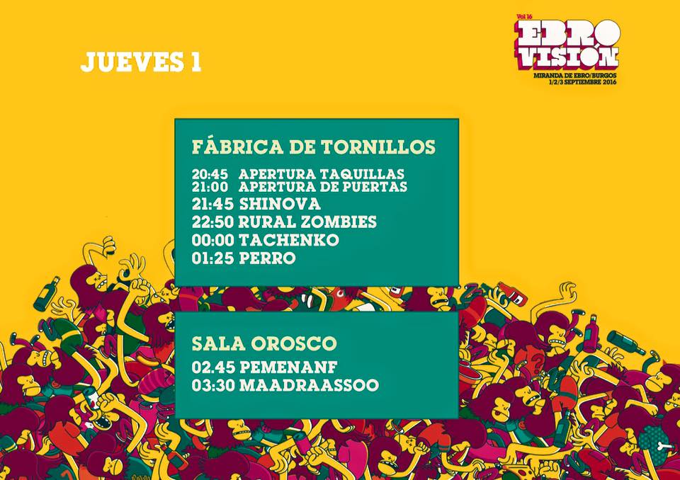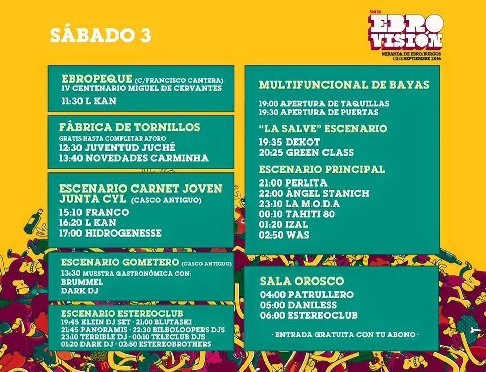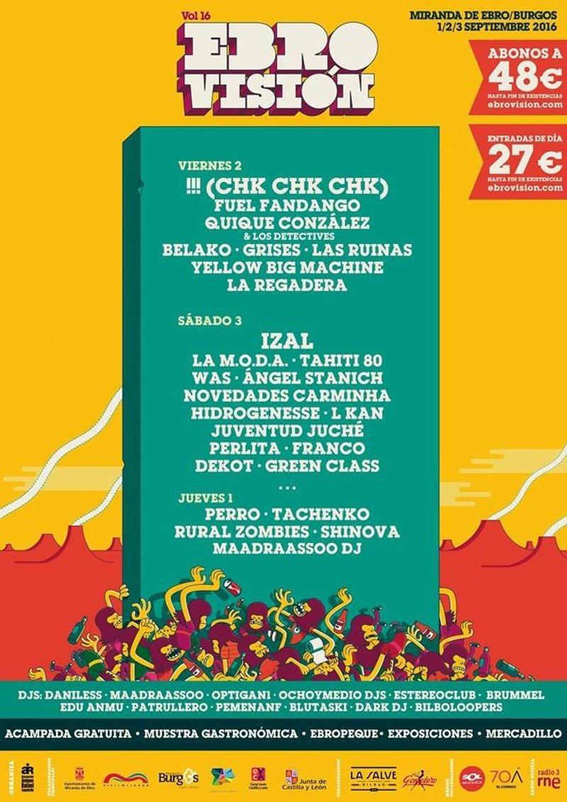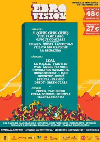 La decimosexta edición del Festival Ebrovisión se celebrará del 1 al 3 de septiembre en Miranda de Ebro (Burgos), con un cartel encabezado por Quique González & Los Detectives, Izal, !!! (Chk Chk Chk), Fuel Fandango y Tahiti 80.