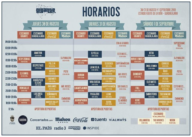 Debido a la cercanía de la celebración del festival, escogeremos al azar a los ganadores este lunes 27 de agosto respondiendo públicamente a los mensajes que previamente nos hayan dejado en Facebook con sus preferencias. Toda la información sobre la fiesta que se avecina está en www.festivalgigante.com, cuyos horarios vemos a continuación como colofón.