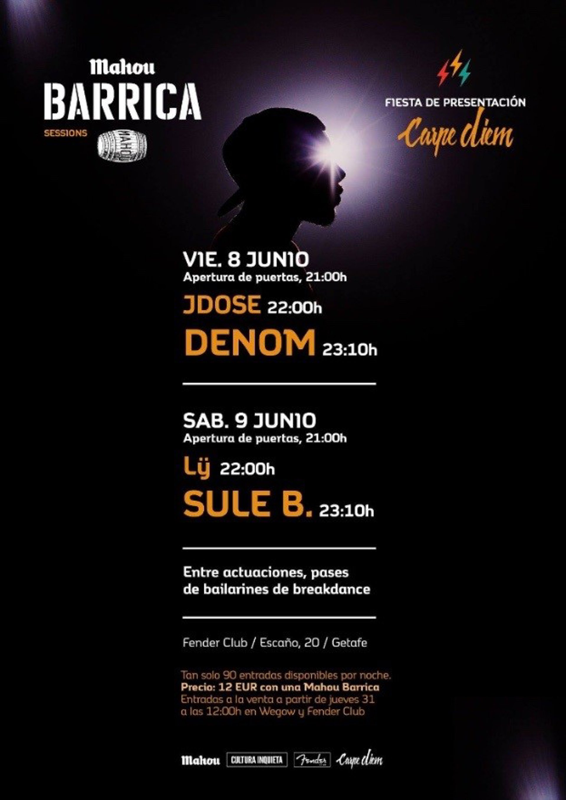 La fiesta, organizada por Carpe Diem junto a Cultura Inquieta y Mahou, también contará con pases de bailarines de breakdance entre actuaciones. Y como parte de las Barrica Sessions, cada entrada incluye una Mahou Barrica o refresco. Las entradas, que tienen un precio de 12 euros, ya están a la venta en Fender Club (Calle Escaño, 20 Getafe) y Wegow