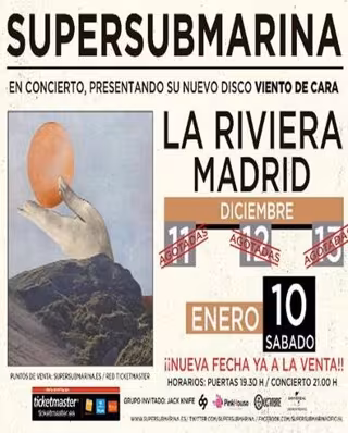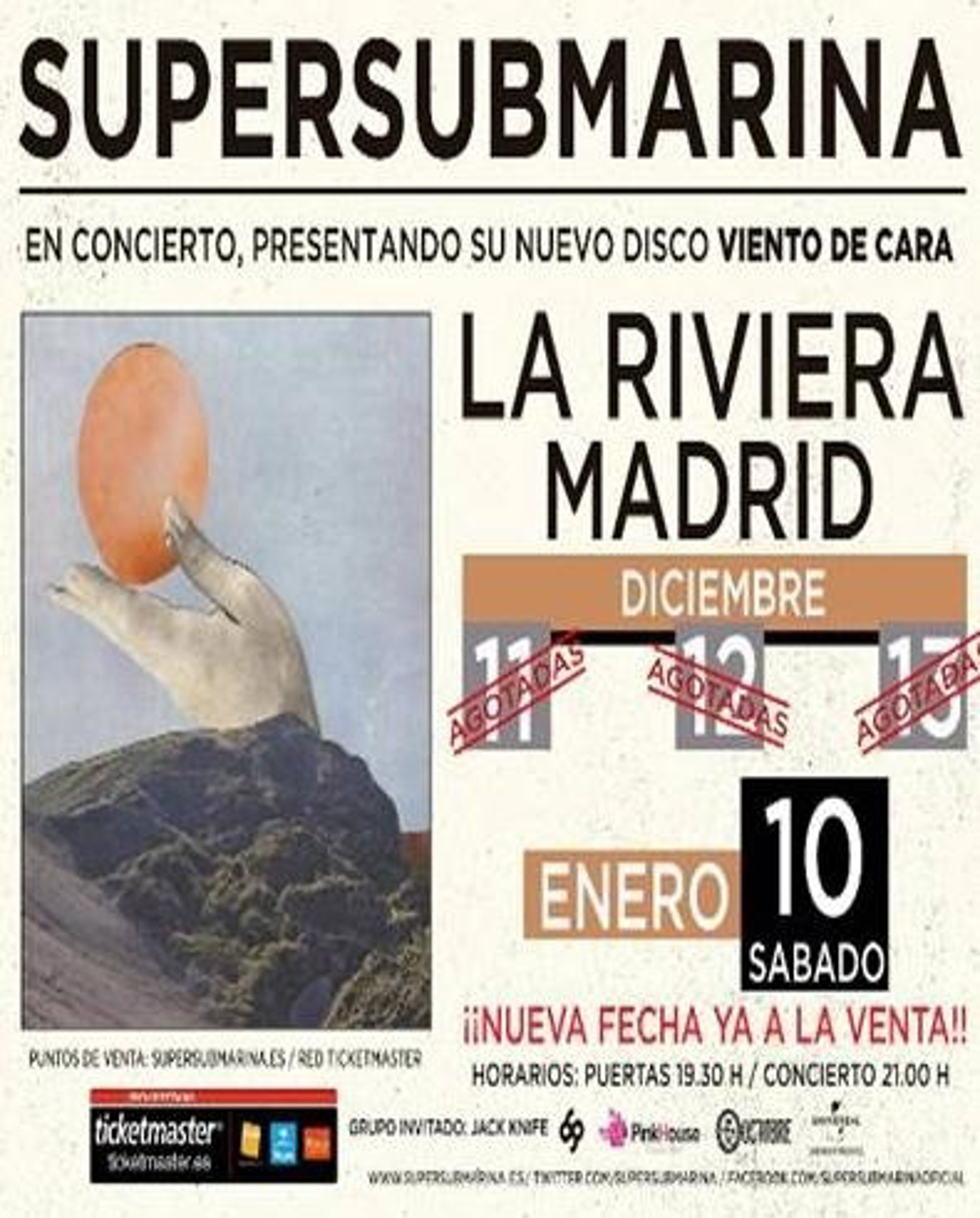 Después de agotar casi dos meses antes las entradas de los tres conciertos que Supersubmarina ofrecerán en diciembre en la sala La Riviera de Madrid en diciembre, la banda de Baeza anuncia una cuarta fecha, que tendrá lugar el sábado 10 de enero 2015.