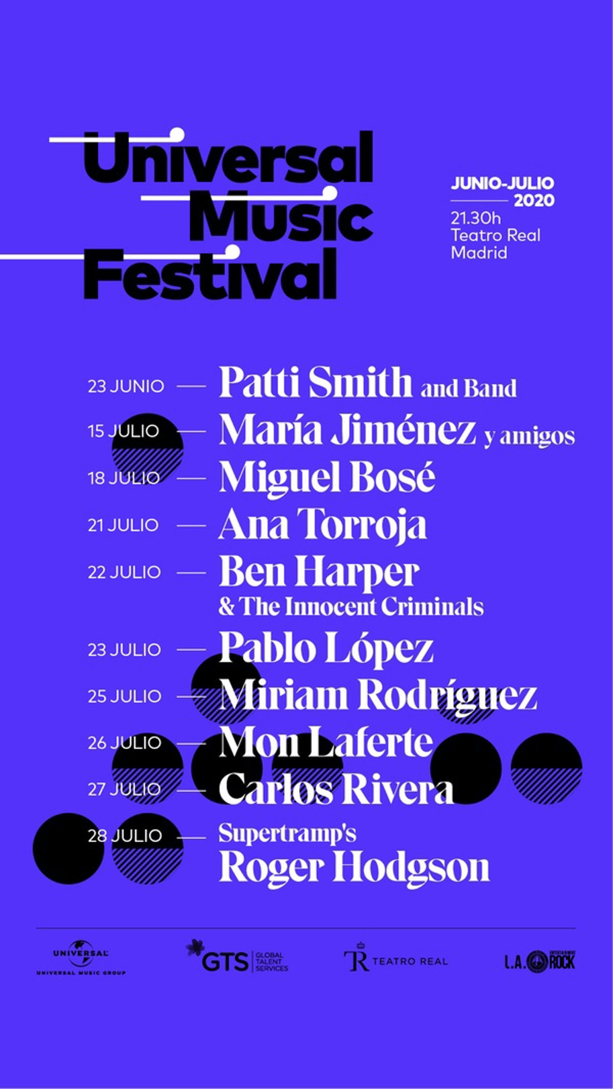 Universal Music Festival 2020 iba a inaugurarse el 23 de junio con la actuación de Patti Smith and Band junto con las sucesivas actuaciones de María Jiménez, Miguel Bosé, Ana Torroja, Ben Harper, Pablo López, Miriam Rodríguez, Mon Laferte, Carlos Rivera y Roger Hodgson.
