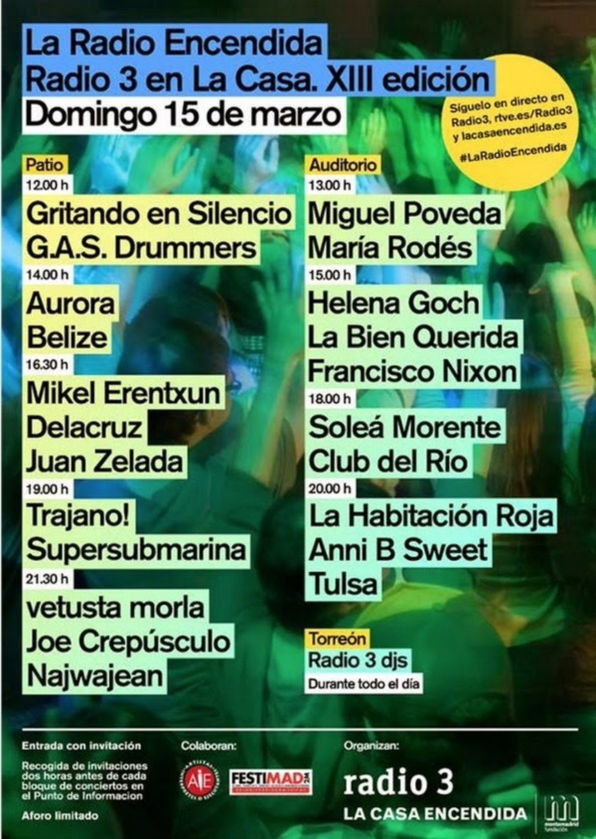 El próximo domingo 15 de marzo se celebrará la decimotercera edición de La Radio Encendida, el festival que se celebra en La Casa Encendida de Madrid y que emite en directo Radio 3, con conciertos gratuitos durante todo el día.