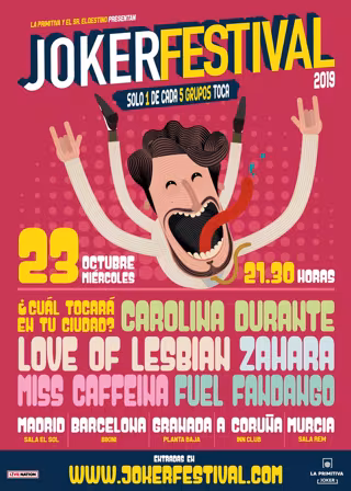 En esta segunda edición, el cartel del Joker Festival está compuesto por Love of Lesbian, Zahara, Miss Caffeina, Carolina Durante y Fuel Fandango. Cada uno de estos cinco grupos tocará el día 23 de octubre, a la misma hora, en una de estas cinco ciudades: Madrid, Barcelona, Granada, A Coruña y Murcia. Y al igual que en la pasada edición, el público no sabrá quién actuará hasta que se levante el telón.