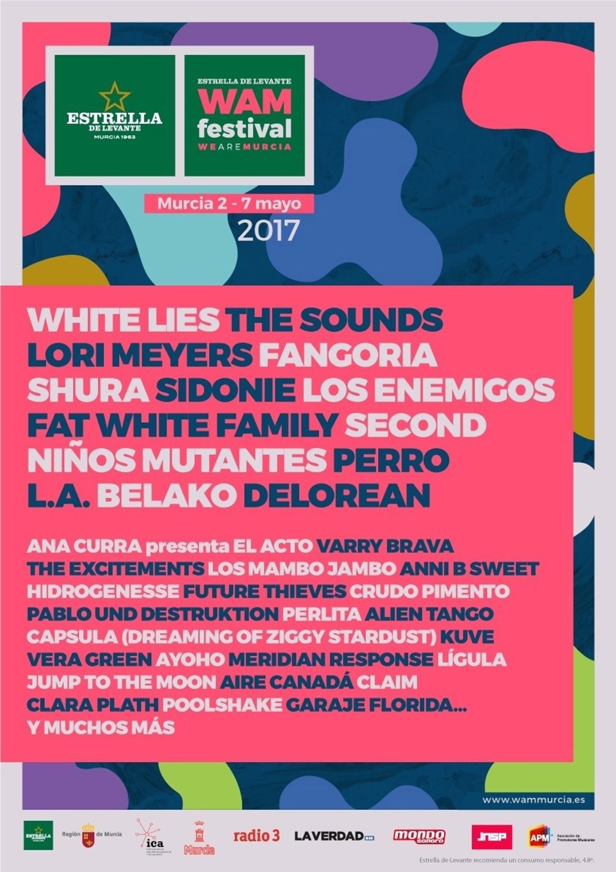 White Lies, The Sounds, Lori Meyers, Fangoria, Shura, Sidonie, Los Enemigos, Fat White Family, Second, Niños Mutantes, Perro, L.A., Belako y Delorean son algunas de las primeras confirmaciones del festival 'We Are Murcia' (WAM), que tendrá lugar del 2 al 7 de mayo y va a inundar la ciudad de cultura de la mano de un "nuevo concepto artístico" que implicará más de un centenar de actividades que no estarán centradas solo en la música.