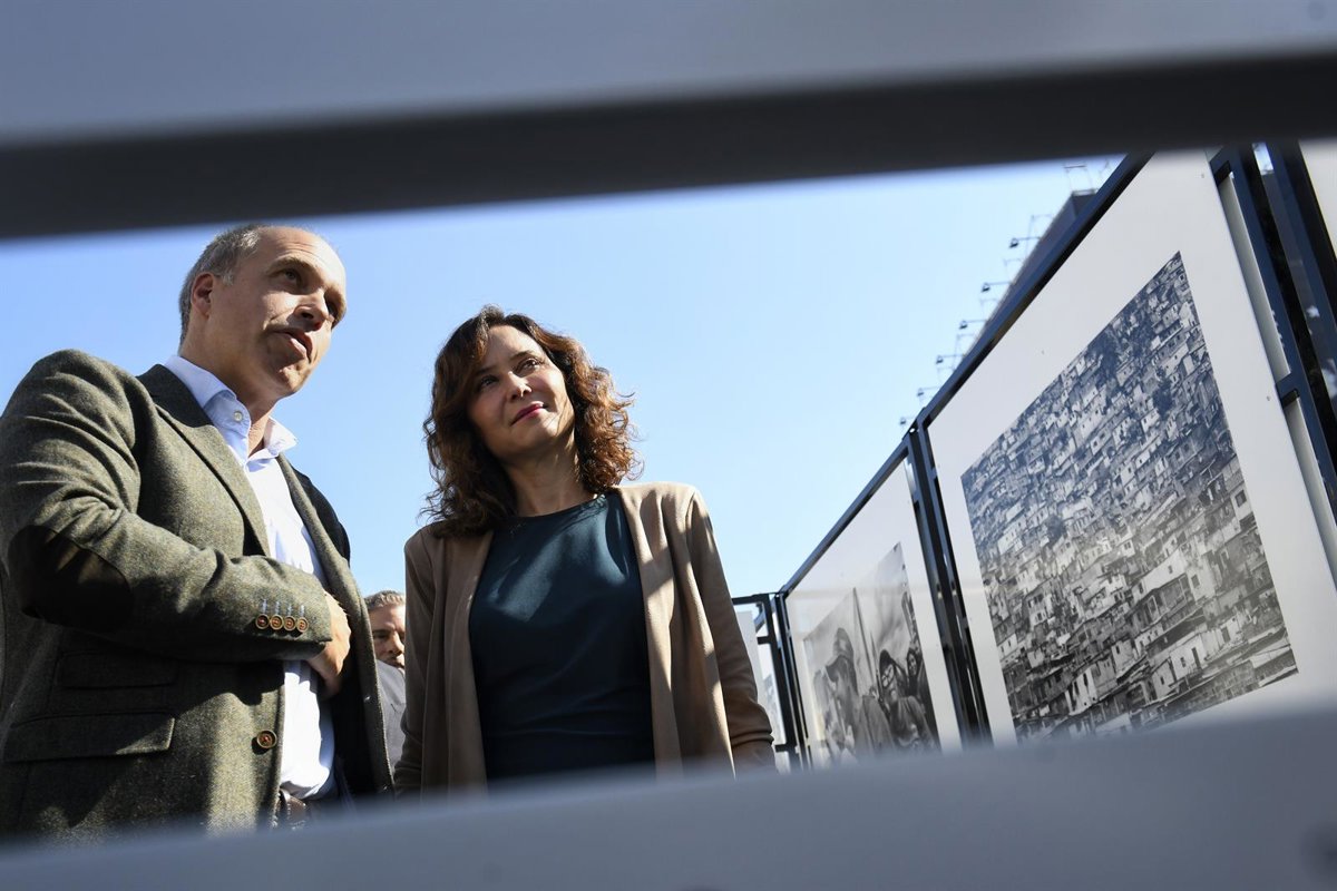 El fotoperiodista Álvaro Ybarra y la presidenta de la Comunidad de Madrid, Isabel Díaz Ayuso, en la inauguración de la exposición ‘Bolivariano’ del fotoperiodista Álvaro Ybarra, en la Puerta del Sol, a 21 de octubre de 2024, en Madrid (España). - Fernando Sánchez - Europa Press