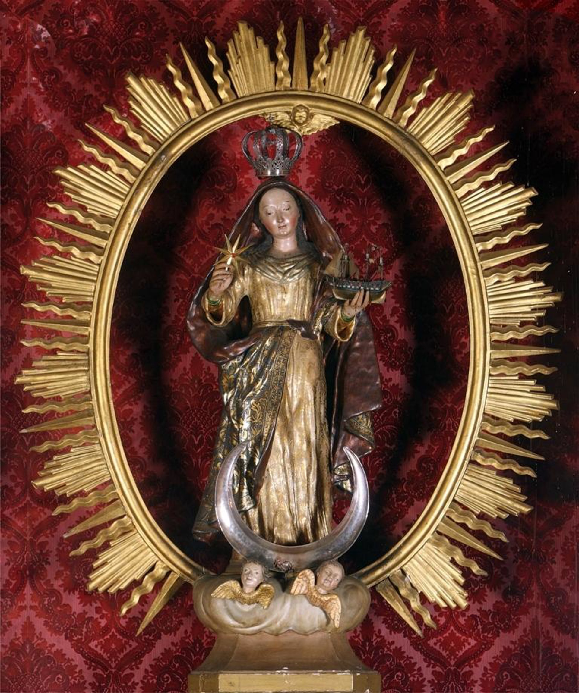 Estos tesoros patrimoniales de Canarias datan en su mayoría del siglo XVII, si bien la antigüedad de las 40 piezas abarca desde principios de aquella centuria hasta el comienzo del XIX, con una gran presencia de obras dieciochescas. Entre ellas, la que puede considerarse "protagonista" , por su carga simbólica, de la parte canaria de la muestra: la escultura de madera de Nuestra Señora del Buen Viaje.