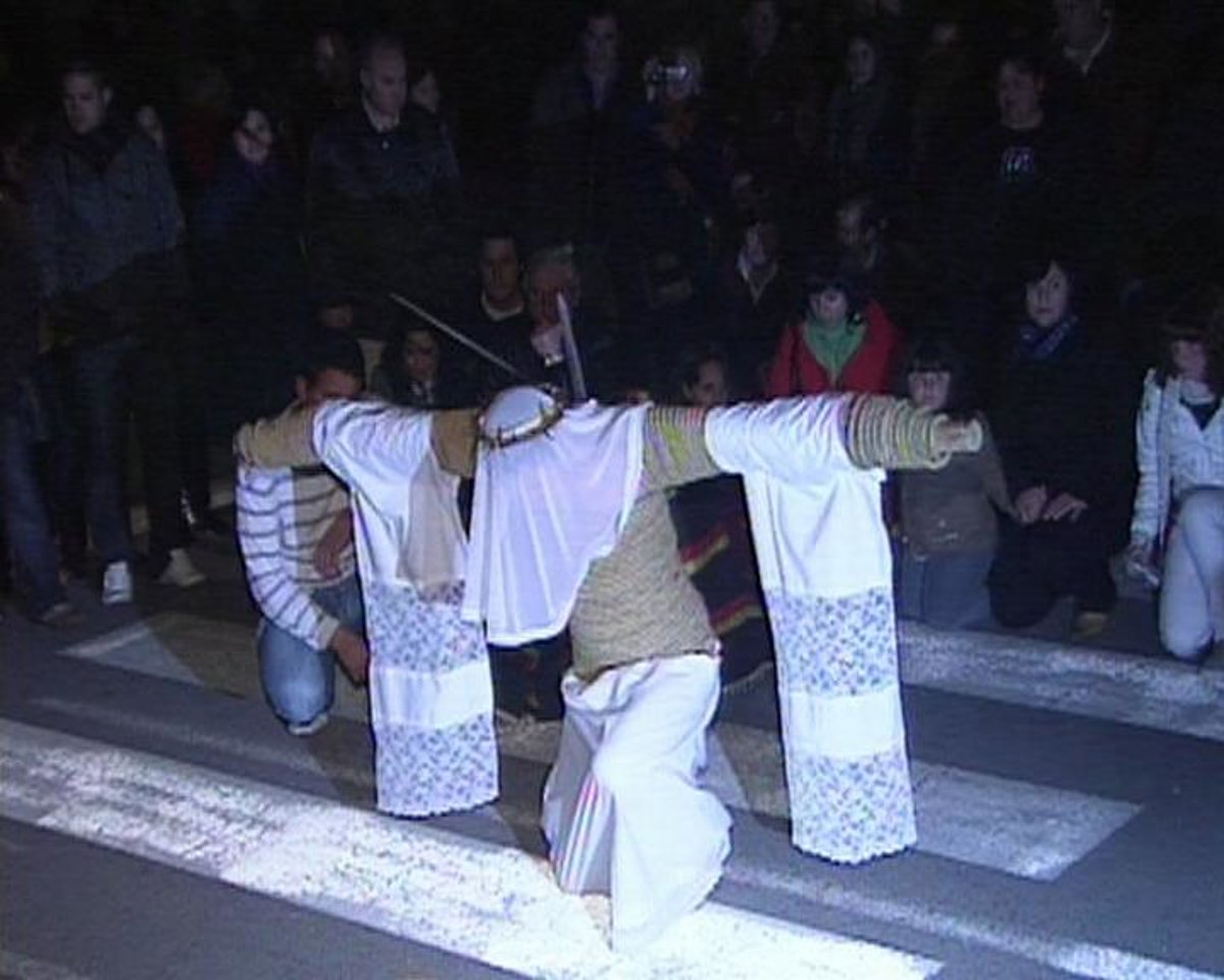 Así, con esta sobrecogedora apariencia, el empalao camina descalzo por la empinadas y pedregosas calles del pueblo para detenerse y arrodillarse, con gran esfuerzo, en cada una de las 14 estaciones que componen el Vía Crucis.