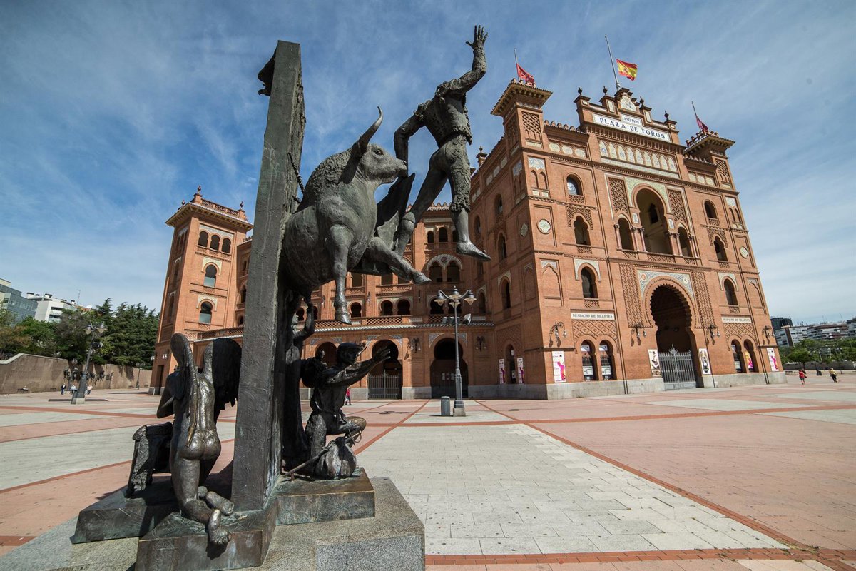 Varias personas caminan junto a la Plaza de Toros de Las Ventas, donde se encuentra la estatuta del torero José Cubero Yiyo, obra del escultor Luis Sanguino - Joaquin Corchero - Europa Press