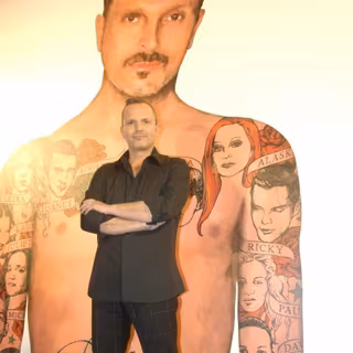 "Todas las canciones son muy sorprendentes", afirmó Bosé, que en la portada de este nuevo trabajo, diseñada por David Delfín, aparece en torso desnudo con los brazos y hombros tatuados con las caras de todos los artistas que han colaborado en el disco. "Un tatuaje es un gesto de amor, amistad y enorme agradecimiento", dijo.