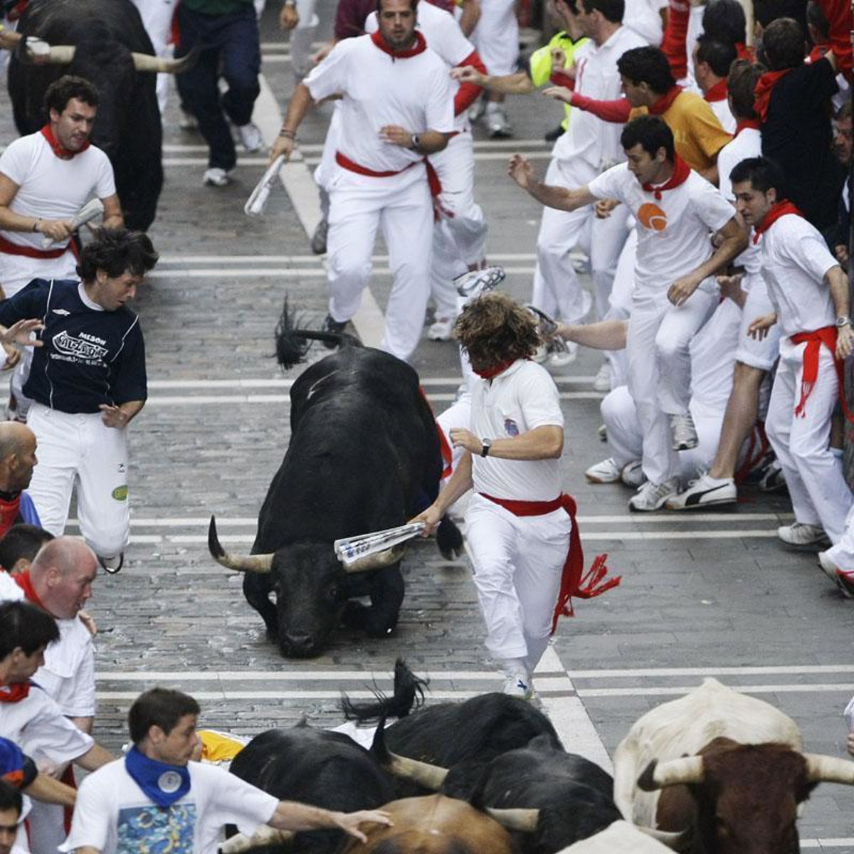 La manada afrontó la calle Estafeta con los cabestros por delante y un grupo formado por los seis toros por detrás. Muy rápidos enfilaron los animales esta calle, en la que dos 'miuras' resbalaron aunque se incorporaron enseguida y pudieron continuar la carrera pocos metros detrás de sus hermanos.