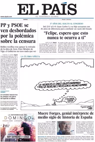 El diario 'El País' publica este viernes la última viñeta del dibujante Antonio Fraguas 'Forges', que ha fallecido este jueves en Madrid a los 76 años víctimas de un cáncer. En esta viñeta, junto a su célebre firma, el autor añade un mensaje para sus lectores: "Os quiero, afirmo".