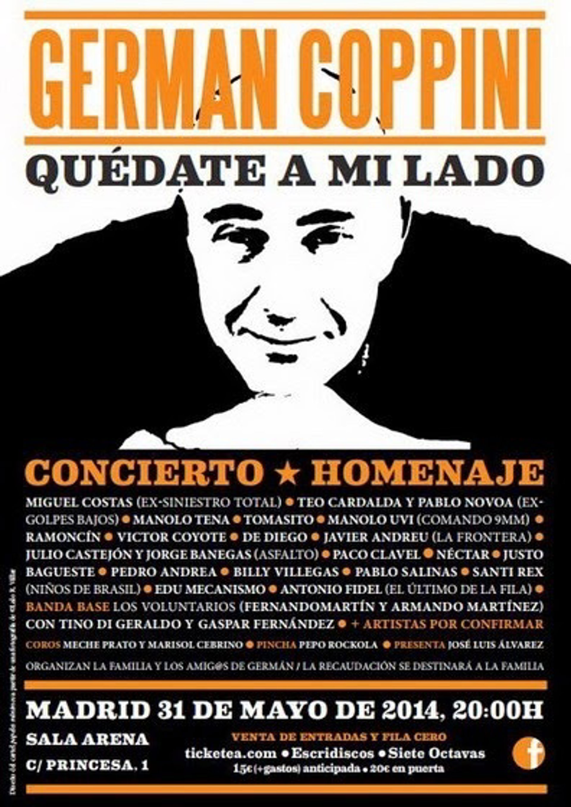 El próximo sábado 31 de mayo se celebrará en la Sala Arena de Madrid un homenaje a Germán Coppini, reconocido músico ex integrante de Siniestro Total y Golpes Bajos, fallecido el pasado 24 de diciembre.