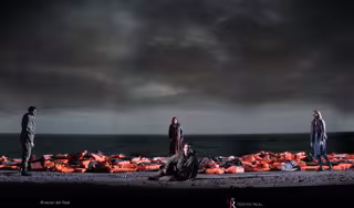 El espectador se coloca junto a los desdichados migrantes en un punto de vista contrario al que acostumbra a asistir a estos eventos migratorios a través de los medios informativos. Al otro lado de la reja, vigilan los militares y de fondo, está el Mediterráneo y un cielo casi azul que aguardan todavía en calma. Se trata de un videomontaje que permanece durante toda la obra y va mutando en tormenta, mar bravo y casi tsunami que parece abalanzarse sobre el foso de la orquesta y cuyo responsable es Will Duke.