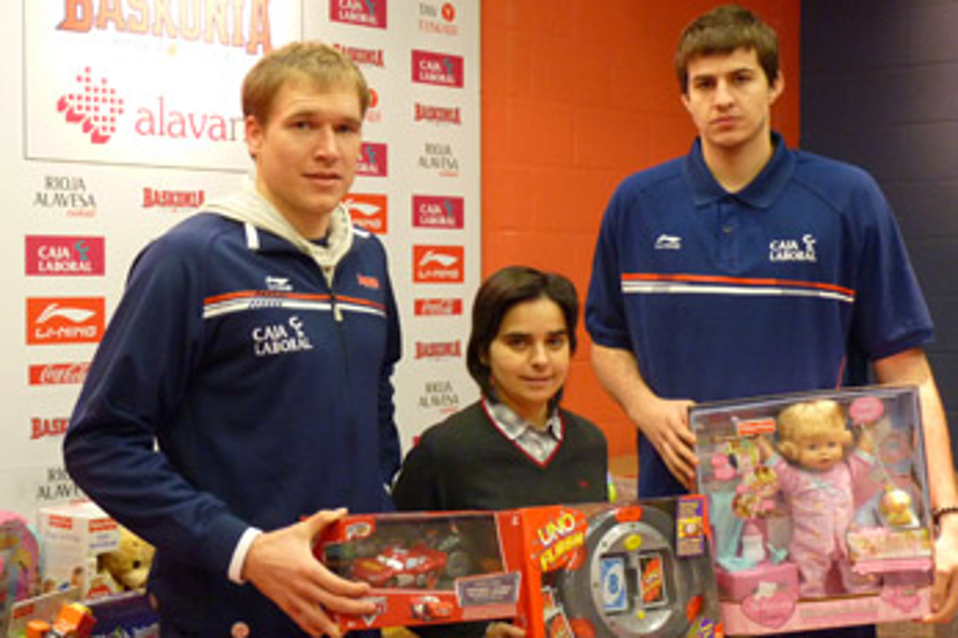 Los jugadores del Caja Laboral Nemanja Bjelica y Brad Oleson han sido los encargados de realizar este miércoles la entrega simbólica de los juguetes recaudados en la campaña 'Encesta su juguete' que anualmente organiza la ACB, conjuntamente con 'Mattel', en las fiestas navideñas.
