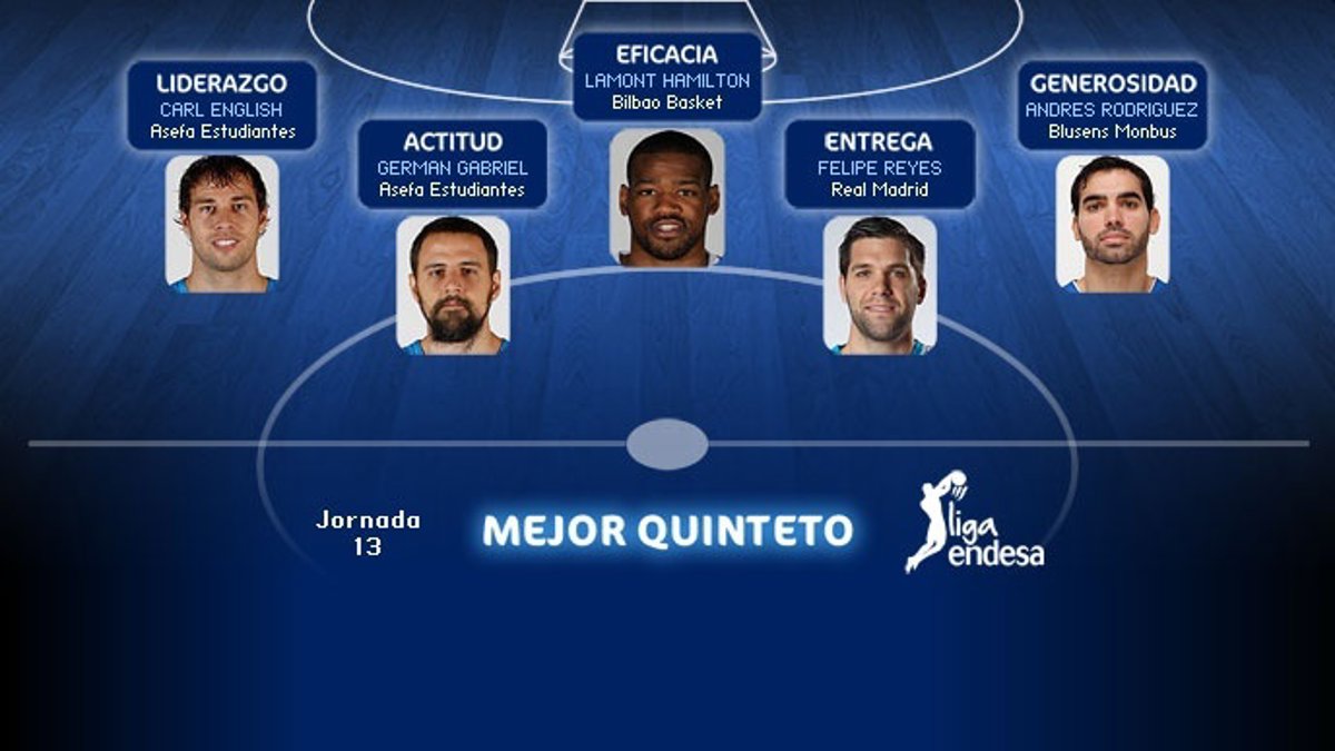 Los jugadores Carl English (Asefa Estudiantes), Germán Gabriel (Asefa Estudiantes), Andrés Rodríguez (Blusens Monbus), Lamont Hamilton (Bilbao Basket) y Felipe Reyes (Real Madrid) conforman como el 'Mejor Quinteto Liga Endesa' de la decimotercera jornada.