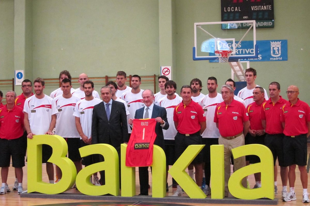 El presidente de Bankia, Rodrigo Rato, ha visitado este jueves a la selección española de baloncesto después del primer entrenamiento del equipo en el Pabellón Triángulo de Oro de Madrid para desearles suerte de cara al Eurobasket de Lituania, donde España defiende el título y en el que están en juego dos billetes directos para Londres 2012.