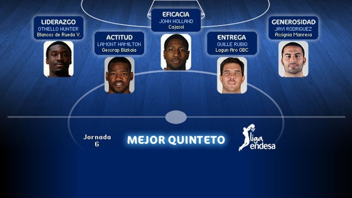 Othello Hunter, del Blancos de Rueda Valladolid, John Holland, del Cajasol, Lamont Hamilton, del Gescrap Bizkaia Bilbao Basket, Javi Rodríguez, del Assignia Manresa, y Guille Rubio, del Lagun Aro GBC, han sido elegidos el 'Mejor Quinteto de la Liga Endesa' de la sexta jornada.
