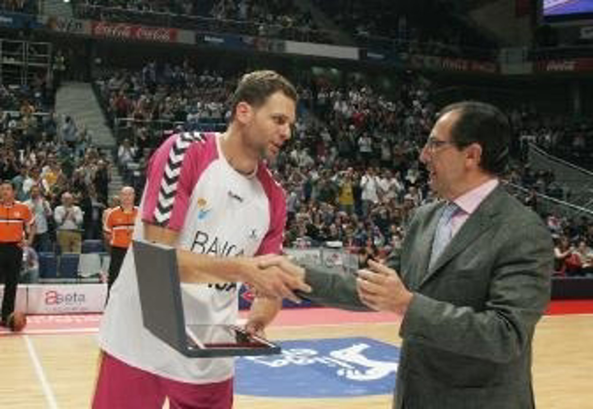 El alero argentino del Banca Cívica, Hernán 'Pancho' Jasen, fue recibido en su vuelta al Palacio de los Deportes con una gran ovación por parte de la afición colegial y de todo un club en el que militó durante diez años antes de marcharse al equipo andaluz.