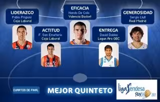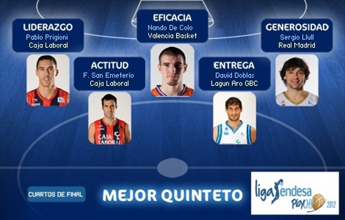 Pablo Prigioni (Caja Laboral), los escoltas Sergio Llull (Real Madrid) y Nando de Colo (Valencia Basket), Fernando San Emeterio (Real Madrid) y David Doblas (Lagun Aro GBC) han sido elegidos 'Mejor Quinteto Liga Endesa' del 'play-off' de los cuartos de final de la competición.