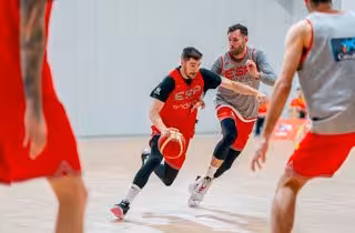 Darío Brizuela y Rudy Fernández en un entrenamiento con la selección española antes del Mundobasket 2023. - FEB